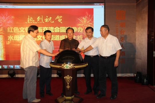 丹青溢彩,翰墨飘香。下午的交流会大家领略了以各位将军为代表的红色书画家的书法魅力。现在,以弘扬红色文化为宗旨的水母网红色文化频道,也将揭开面纱。下面有请领导共同启动水母网红色文化频道。